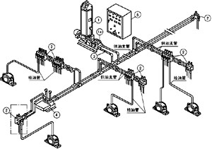 一、系統(tǒng)介紹 基本動(dòng)作和前述電動(dòng)終端式系統(tǒng)相同。二次分配由雙線分配器②的出油口接二次供油管向遞進(jìn)式分配器③供油,這樣,雙線式分配器的一個(gè)出油口可向4~8個(gè)潤滑點(diǎn)給油。 在分配器②和③之間的配管較長的情況下,為使分配器③動(dòng)作有充分的保證,采用了壓力控制閥⑥,使主管壓力升高。壓力控制閥安裝在距壓差開關(guān)/壓力操縱閥⑤1米以內(nèi)的主管上。 壓差開關(guān)/壓力操縱閥后續(xù)需布置一塊雙線式分配器(見下圖接線框內(nèi)),這塊分配器上不要再接遞進(jìn)式分配器,進(jìn)行二次分配。壓差開關(guān)/壓力操縱閥一般安裝在壓力損失最大處的供油主管末端。 電動(dòng)環(huán)式系統(tǒng)亦能布置二級(jí)分配,壓力控制閥安裝在距液壓換向閥回油口1米以內(nèi)的主管上。 二、特 點(diǎn) 適用于潤滑點(diǎn)眾多,給油量相同、分布集中的場合。 空間狹小難于確認(rèn)分配器動(dòng)作的場合,使用效果好。 和壓力控制閥配合使用,可以采用細(xì)長的管路。 檢查部位集中,便于維護(hù)管理。 四、系統(tǒng)裝置簡圖 |