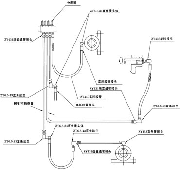 配管例④(分配器→軸承配管要領(lǐng)-移動(dòng)、旋轉(zhuǎn)部件) 對(duì)于移動(dòng)部件應(yīng)使用膠管(特殊及高溫場合使用金屬軟管) 對(duì)于旋轉(zhuǎn)軸,軸端安裝旋轉(zhuǎn)接頭并和膠管連接。 |