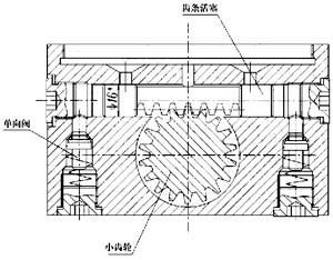 其工作原理是:板動(dòng)手柄,通過(guò)齒輪軸上的小齒輪(如圖2)帶動(dòng)齒條活塞作往返復(fù)運(yùn)動(dòng)。當(dāng)活塞處于右端極限位置左行量,潤(rùn)滑脂通過(guò)單向閥經(jīng)過(guò)換向閥被壓入主油管,當(dāng)滑動(dòng)活塞行程終了,到達(dá)左端極度限位置時(shí),滑動(dòng)活塞右端的腔室又被貯油器中有潤(rùn)滑脂所充滿。當(dāng)滑動(dòng)活塞再向右移動(dòng)時(shí) ,滑動(dòng)活塞右端的單向閥,經(jīng)換向閥而被壓入主油管,這樣繼續(xù)扳動(dòng)手柄,油泵將不斷地往復(fù)運(yùn)動(dòng),把潤(rùn)滑脂不斷地壓向各組給油器。