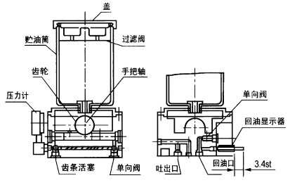 手動(dòng)潤(rùn)滑泵是借人工擺動(dòng)手把,通過(guò)齒輪帶動(dòng)齒條活塞往復(fù)運(yùn)動(dòng)實(shí)現(xiàn)向外供油的,當(dāng)活塞處于圖示極限位置時(shí),潤(rùn)滑脂通過(guò)吸入口吸入并充滿活塞的右腔,當(dāng)活塞向右移動(dòng)時(shí),被吸入的潤(rùn)滑脂在油壓的作用下頂開單向閥壓送至出口向外排出,當(dāng)系統(tǒng)中主分配器的一計(jì)量油口返回至回油指示器的油量達(dá)到3.2mL時(shí),指示桿全部伸出,證明系統(tǒng)所有潤(rùn)滑點(diǎn)已得到所需的潤(rùn)滑油量,此時(shí)停止操作手把并把指示桿向內(nèi)壓進(jìn),為下循環(huán)準(zhǔn)備,指示器內(nèi)的潤(rùn)滑脂經(jīng)單向閥返回貯油桶內(nèi)。