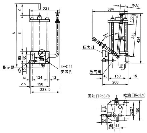 | 六、使用說(shuō)明 1、手動(dòng)潤(rùn)滑泵應(yīng)垂直安裝,泵的上方及周圍要留有指示桿上升及補(bǔ)脂操作的空間。需在室外或環(huán)境惡劣的場(chǎng)合安裝時(shí),應(yīng)將泵置于防護(hù)罩內(nèi)。 2、貯油器內(nèi)無(wú)潤(rùn)滑脂時(shí),不許操縱手柄,至下油位應(yīng)及時(shí)補(bǔ)脂。 3、向貯油器內(nèi)補(bǔ)脂,必須使用手動(dòng)或電動(dòng)補(bǔ)脂泵從補(bǔ)脂口充填。 4、安全閥出廠已調(diào)至公稱壓力,無(wú)故不許隨意調(diào)節(jié)。 5、泵上回油指示器的作用是操作者通過(guò)觀察指示器活塞指示桿的運(yùn)動(dòng)行程,就可知道潤(rùn)滑系統(tǒng)的供油狀況。使用時(shí),先計(jì)算好各潤(rùn)滑部位所需的給油量,配置分配器,并把主分配器上多設(shè)的一個(gè)出油口與手動(dòng)潤(rùn)滑泵的回油口接通,使?jié)櫥祷氐街甘酒髦?,如返回的油量累?jì)達(dá)到3.28mL,則指示器的活塞指示桿全部伸出,表示各潤(rùn)滑點(diǎn)已根據(jù)需要完成一個(gè)周期的給油,應(yīng)停止供油并把回油指示器的指示桿推進(jìn)。 | |||||||||||||||||||||||||