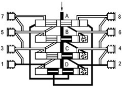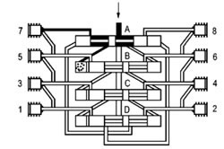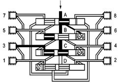 當(dāng)活塞D打通通向活塞A左側(cè)終端的連接通道后,潤滑劑流動并將活塞A向右推動。位于活塞A前右側(cè)的潤滑劑輸送到排出口1。 這時活塞B至D從左側(cè)向右側(cè)運動,按以上相反方向順序動作完成一個周期循環(huán)并可重新開始一個新的循環(huán)。