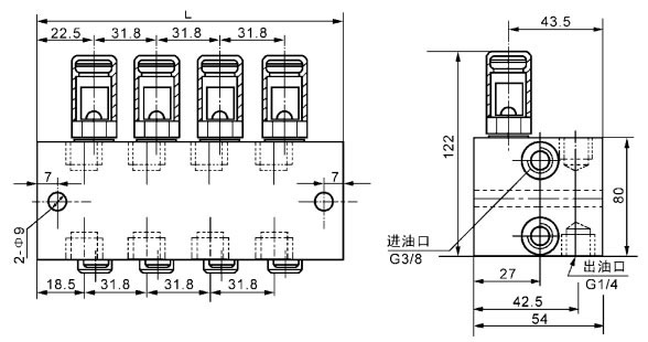 若需相應上下出口合并時,只要將孔內(nèi)的螺釘擰出,把上或下不用的那個出油口用G1/4螺塞封堵以防灰塵侵入。