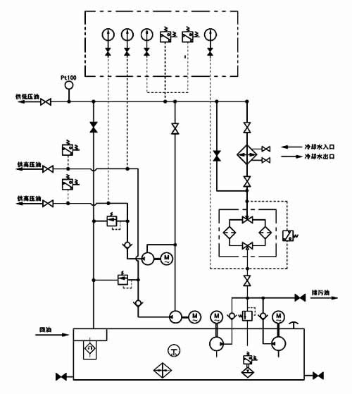 雙高壓高(低)壓稀油站的主要特點為一套稀油站有二根高壓輸出管道,可滿足二個高壓潤滑點的需要,其他和普通高(低)壓稀油站相同。 每根高壓輸出管道均有壓力表和壓力控制器,以便控制每根高壓管道的壓力及觀察工況。 本產品組成部分也和普通高(低)壓稀油站相同;僅比它多一臺高壓油泵,二臺高壓油泵的吸口均聯(lián)于低壓泵的供油口;二臺高壓泵均啟動時,要從低壓供油口吸走5L/min的潤滑油,對低壓泵流量較小者,啟動高壓泵時低壓供油壓力可能會有所降低,對潤滑油均供向同一軸承的系統(tǒng)來說,軸承的潤滑油總量并未減少,不會影響對軸承的潤滑;但啟動高壓泵時,低壓壓力的降低可能造成備用低壓泵會臨時啟動,這種情況也不致影響潤滑系統(tǒng)的正常工作;但采用二低壓泵互相切換的備用工作方式時,可能工作泵停止后,備用泵流量仍不滿足要求時就不能使?jié)櫥到y(tǒng)正常工作了;故選用較小流量低壓泵時應注意這一情況。 |
